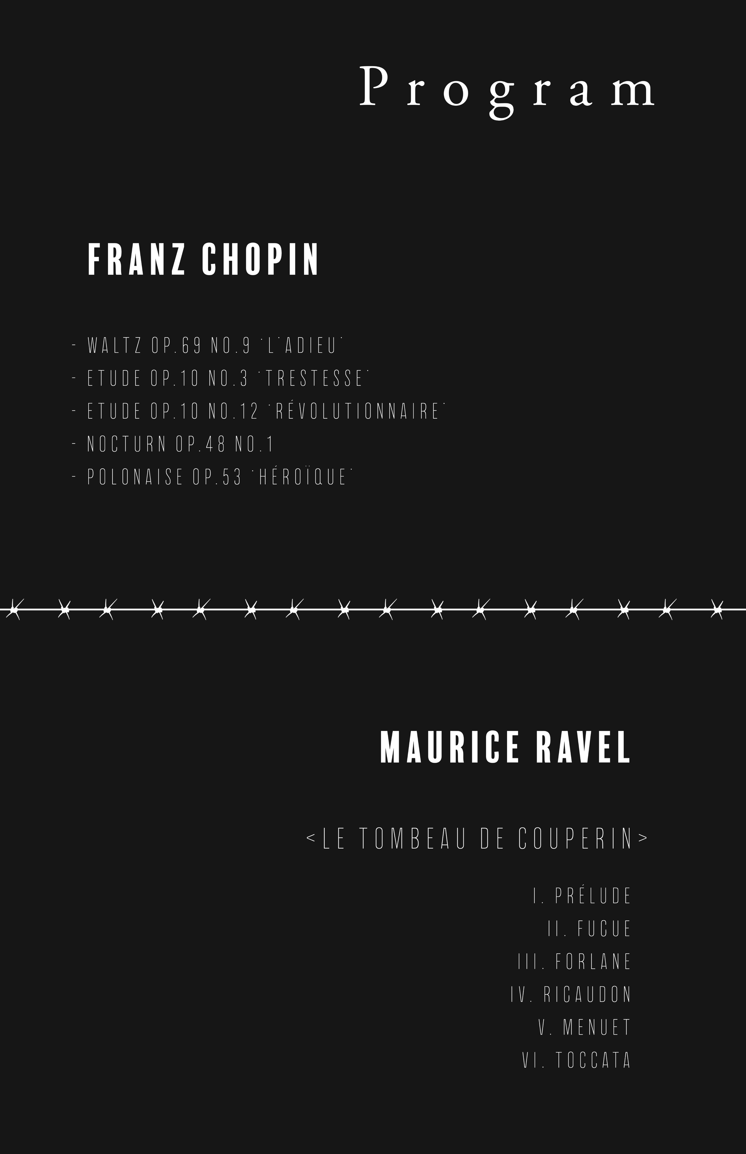 Part One consists of several pieces by Polish composer Frederick Chopin. After the failed Polish Revolution of 1830, Chopin was never able to return to his motherland and spent the rest of his life mourning the separation. On the last day of his life, he left a living will that his heart be returned to Poland. Each piece on the first half of the recital has subtitles reflective of his traumatic separation, including ‘Farewell’, ‘Sadness’, ‘Revolution’ and ‘Hero’.