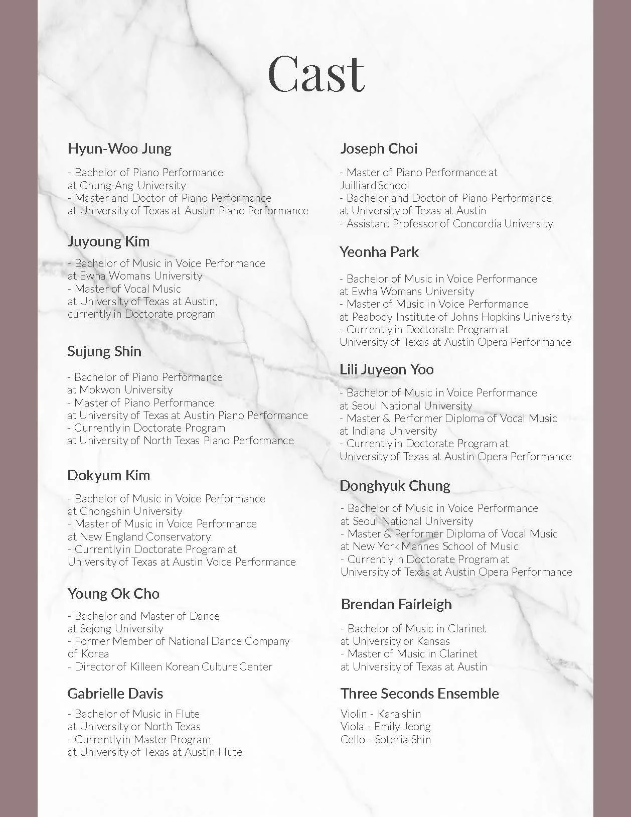 Both composers’ works reflect their sorrow and pain from the loss of friends and family to tragic wartime violence, displacement, and division. In these commemorative recitals, Dr. Jung hopes to create spaces of music and community where people can come together and remember that regardless of country or era, we can share pain and recover together.